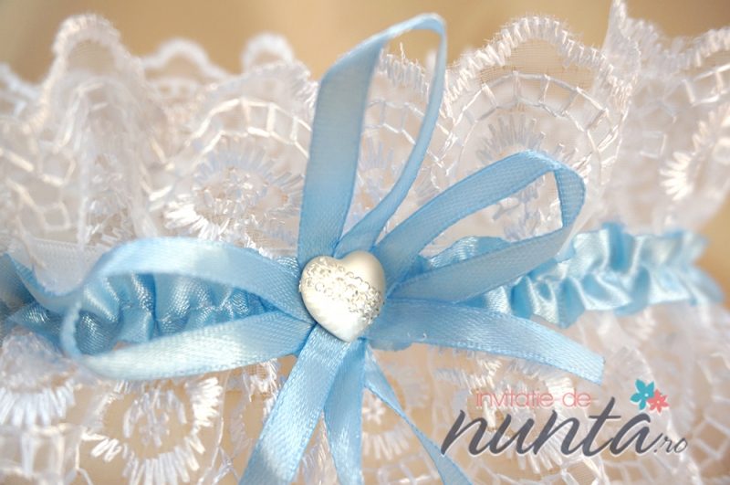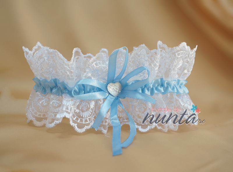 Jarteluta din dantela alba si satin de culoare bleu, cu fundita si accesorizata cu o inimioara.