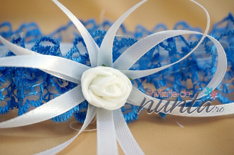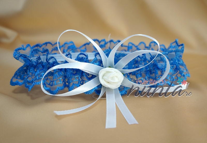 Jarteluta din dantela albastra si fundita din satin de culoare alba. Jarteluta este accesorizata cu un trandafiras din satin alb.