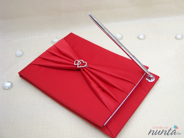 Caietul de impresii este rosu, accesorizat cu o fundita din satin rosie si o brosa deosebita din strasuri, in forma de inimioare. Suportul de pix este atasat caietului iar pixul corespunzator este argintiu si vine impreuna cu caietul de impresii.