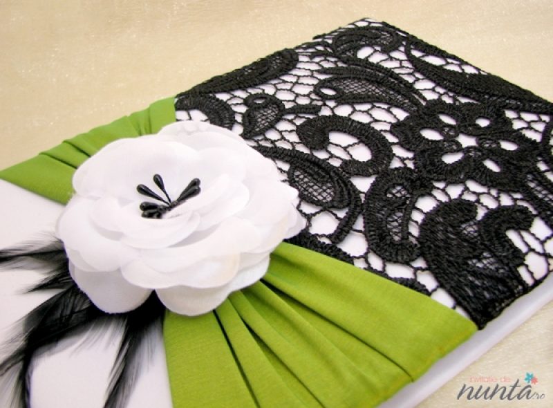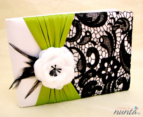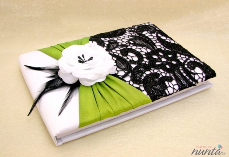 Un caiet de impresii deosebit, decorat cu motive florale, trandafiras alb, fulgi de culoare neagra si funda din saten verde. Acest accesoriu de nunta va fi, cu siguranta, admirat de toti cei care isi vor scrie gandurile in el.