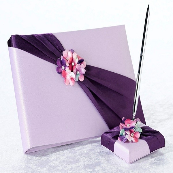 Imbracat in satin violet, acest radiant caiet de impresii si pix face parte din colectia Floare Radianta! Caietul de impresii Floare Radianta este accesorizat cu o fundita de un violet inchis, tot din acelasi material, satin, alaturi de multe floricele intr-o varietate de nuante de roz si violet. La o privire mai atenta puteti observa ca floricelele sunt decorate in mijloc cu un minunat stras. Caietul de impresii contine 30 de pagini si poate sa cuprinda pana la 580 de semnaturi.