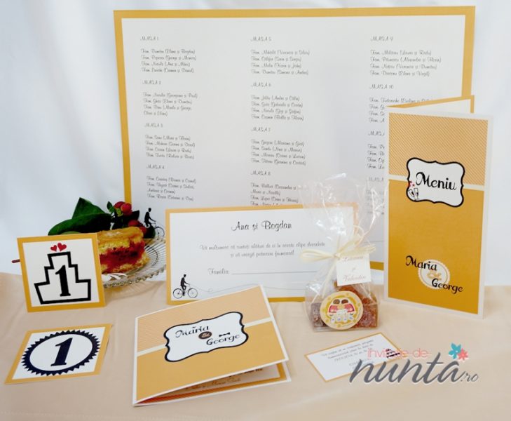 Se pot realiza in aceeasi gama asortata nuntii voastre si alte accesorii: carduri de confirmare, place-card-uri / plicuri de bani, marturii, meniuri si numere de masa, lista de asezare a invitatilor, etc.