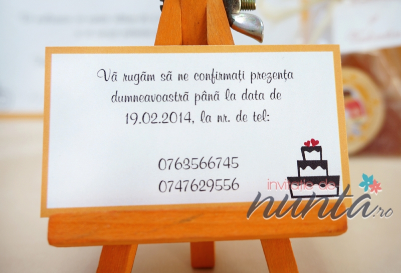 Card de confirmare ce va insoti invitatia dumneavoastra. Cardul este confectionat din carton mat, avand un design retro, cu chenar portocaliu si ilustratia unui tort cu doua inimi.