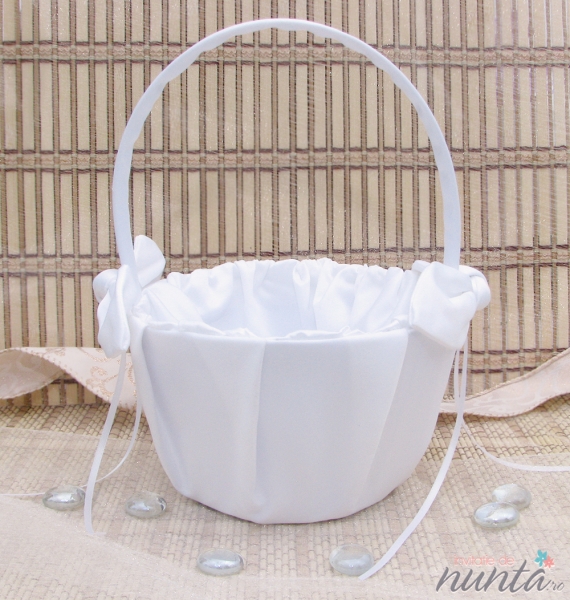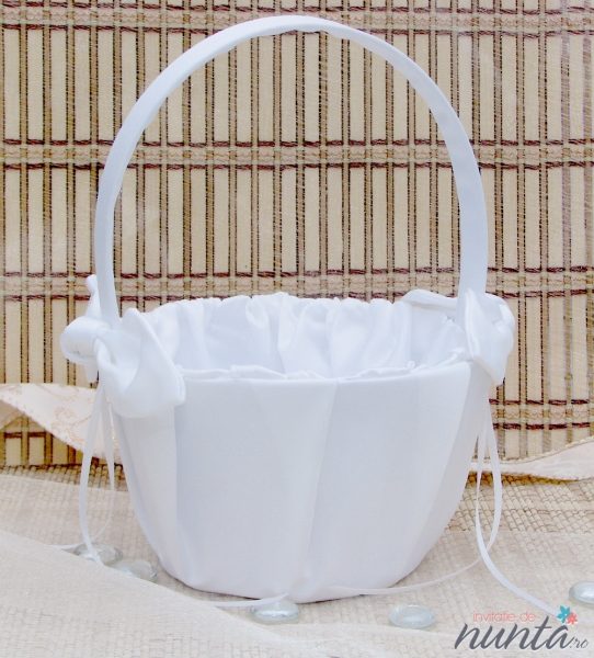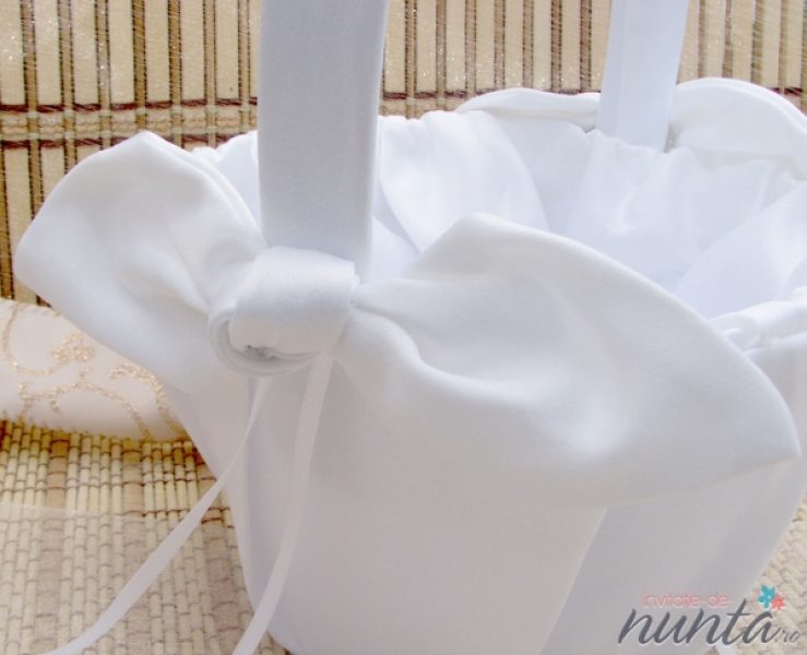 Cosulet pentru cocarde sau flori, imbracat in material alb si accesorizat cu doua fundite, de-o parte si de alta a manerului.