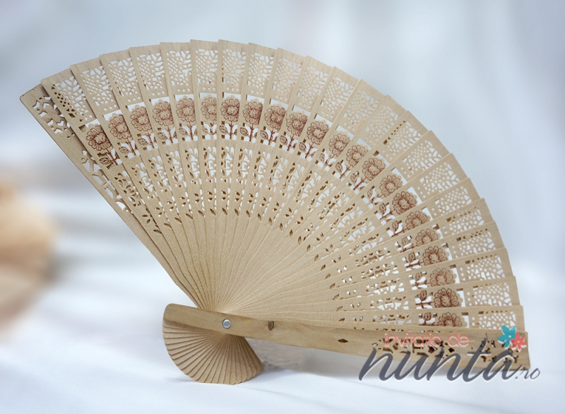 Evantai confectionat din lemn cu model perforat si floricele gravate.