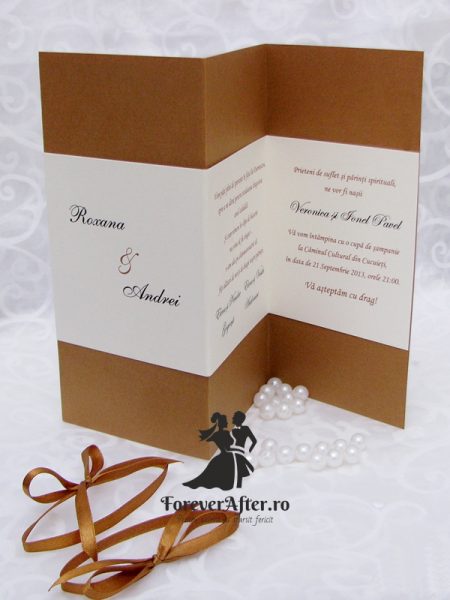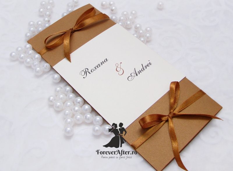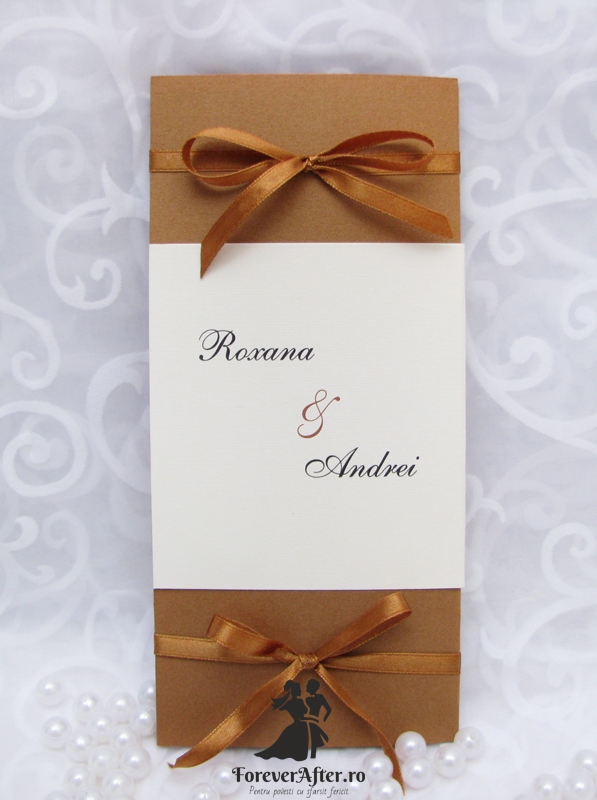 Daca iti doresti o nunta eleganta opteaza pentru o invitatie in culori neutre. Cartonul maro sidefat al acestei invitatii ii ofera stralucirea necesara pentru a scoate in evidenta detaliile si liniile simple, dar elegante. Invitatia se prinde cu doua fundite din satin de culoare maro.