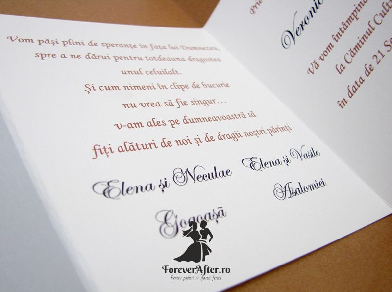 Invitatia poate fi personalizata in functie de tematica si cromatica nuntii.