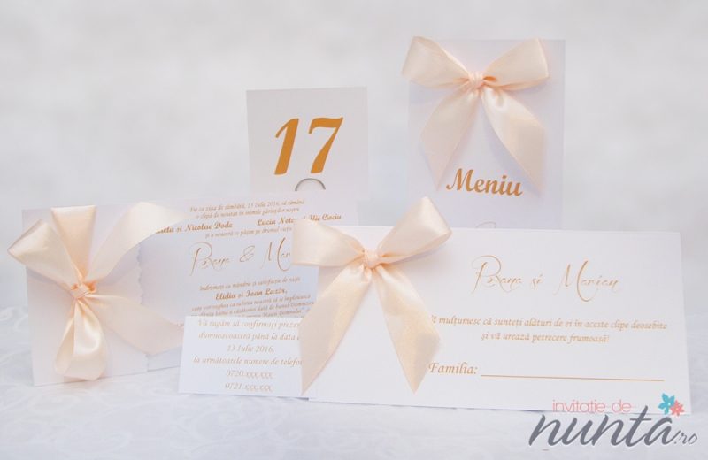 Se pot realiza in aceeasi gama asortata nuntii voastre si alte accesorii: carduri de confirmare, place-card-uri / plicuri de bani, marturii, meniuri si numere de masa, lista de asezare a invitatilor, etc.