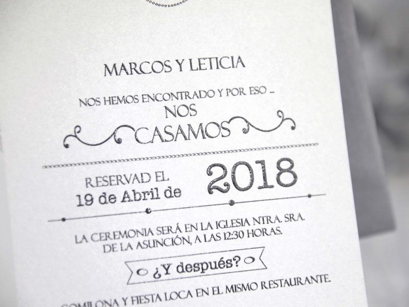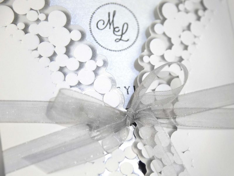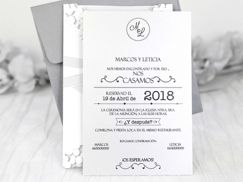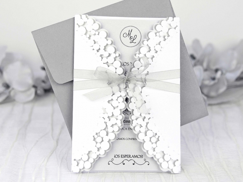 Daca iti doresti o nunta clasica in nunatele traditionale opteaza pentru aceasta invitatie. Invelitoarea alba dintr-un carton embosat se deschide pe mijloc cu o panglica argintie si are marginile decupate pe rotund. Textul va fi scris pe un carton lucios argintiu ce aduce acea nota de eleganta invitatiei.