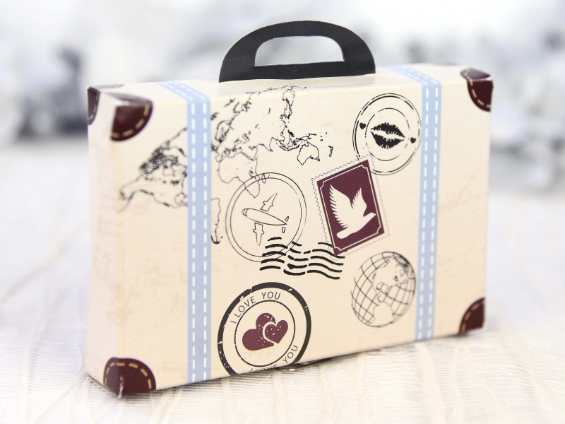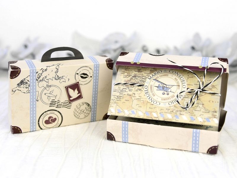Cutia acesteia este sub forma unei valize crem pe care sunt desenate avioane si diferite harti.