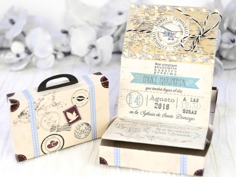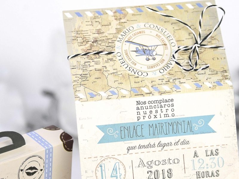 Cheama-i si pe cei apropiati cu tine in voiajul iubirii tale. Invitatia este confectionata dintr-un carton lucios crem precum o harta si se pliaza in patru parti. Este accesorizata cu un snur impletit alb si negru.