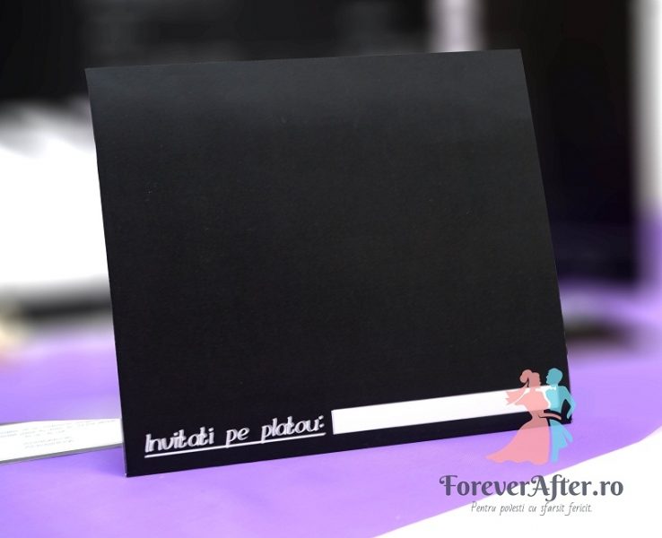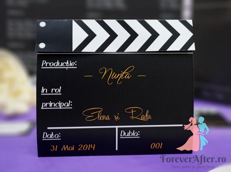 Povestea voastra de dragoste este minunata si merita sa fie transpusa intr-un flm. Prin intermediul invitatiilor Cinema vei arata tuturor ca un film de succes, asa cum este al vostru, poate fi facut dintr-o singura dubla. Invitatia este confectionata in forma de clapa de delimitare a scenelor de film in nuante de negru si alb. Aceasta se pliaza pe orizontala in doua locuri, iar textul se tipareste in interior.