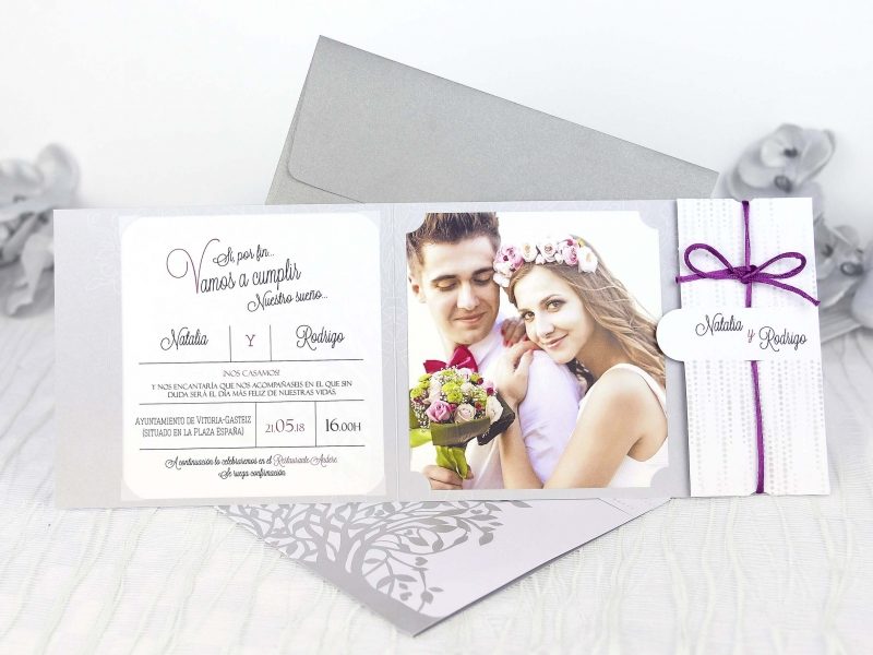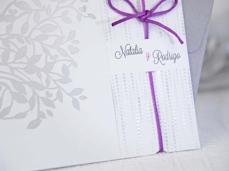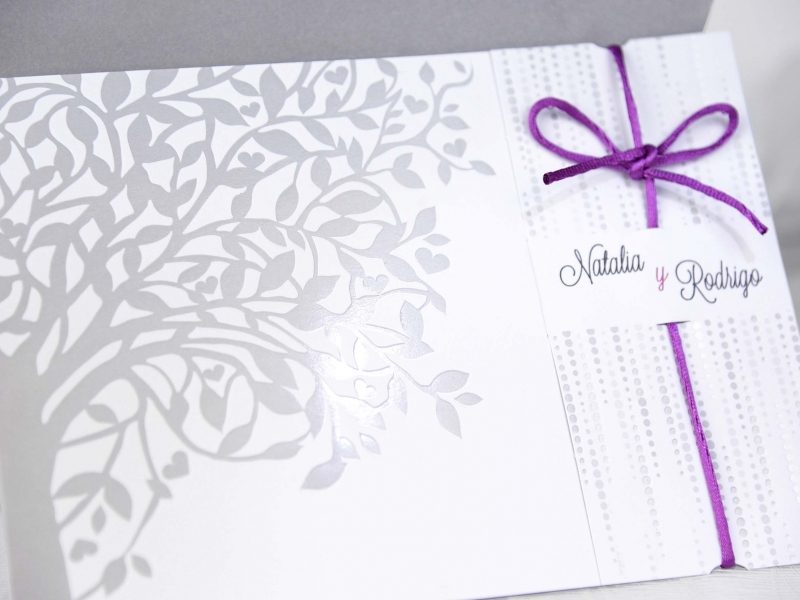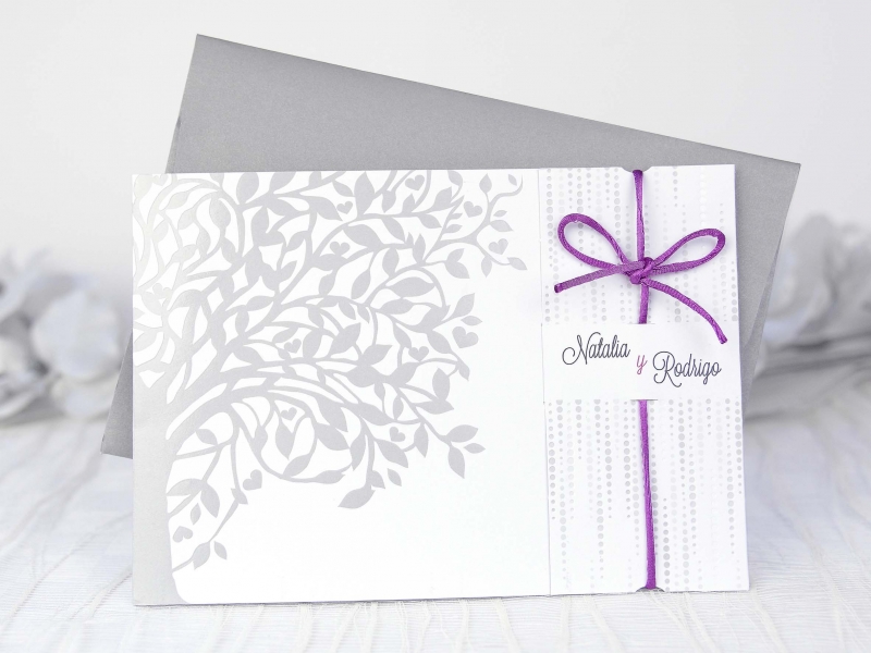 Invitatia este confectionata dintr-un carton alb embosat si se pliaza pe vertical. Pe coperta este copacelul dragostei de culoare gri si numele vostru. In interior, textul se afla pe partea stanga, iar pe partea dreapta este prinsa poza ta preferata cu voi doi. Invitatia este accesorizata cu un snur mov.