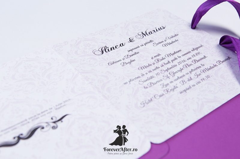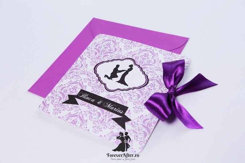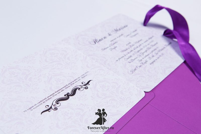 Imprimeul Damask va fi intotdeauna o alegere eleganta. Combinatia dintre acest imprimeu si movul roial transforma invitatia Purple Damask intr-o invitatie demna de o petrecere regala exact asa cum va fi si nunta voastra. Invitatia este accesorizata cu o panglica din satin mov.