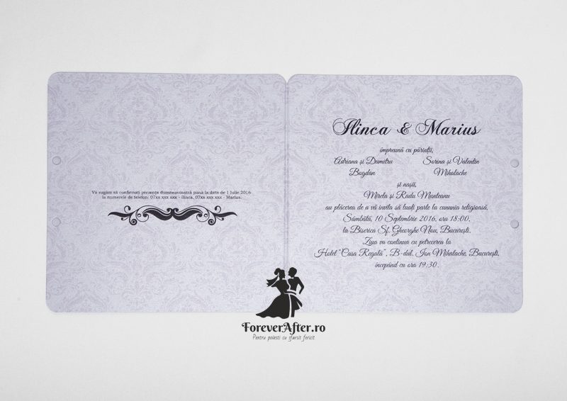 Invitatia poate fi personalizata in functie de tematica si cromatica nuntii.