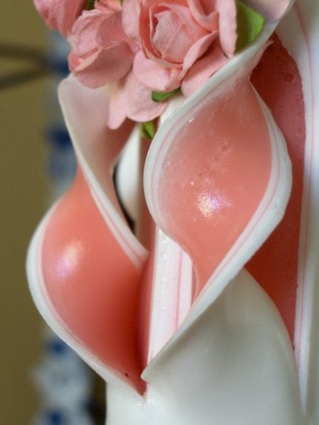 Lumanare roz, sculptata in partea superioara, care nu necesita aranjament floral.