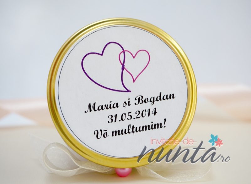 Capacul borcanasului este decorat cu o eticheta alba, ilustrata cu doua inimioare si personalizata cu numele mirilor si data nuntii. Marturia este accesorizata cu o fundita din organza alba si o perluta roz.