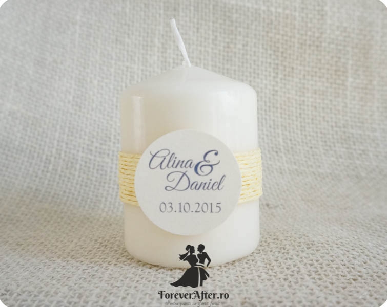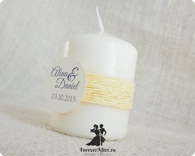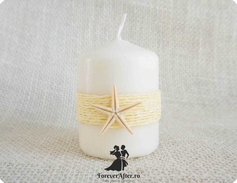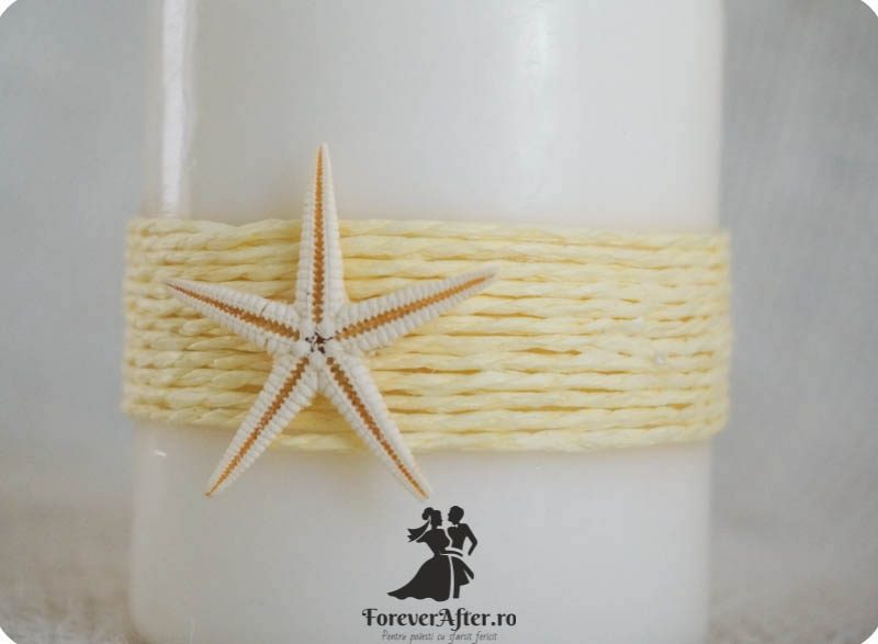 Marturie lumanare cu tema marina, decorata cu snur crem, in partea din fata este un tag unde sunt trecute numele mirilor si data evenimentului, iar in partea din spate este lipita o steluta de mare.