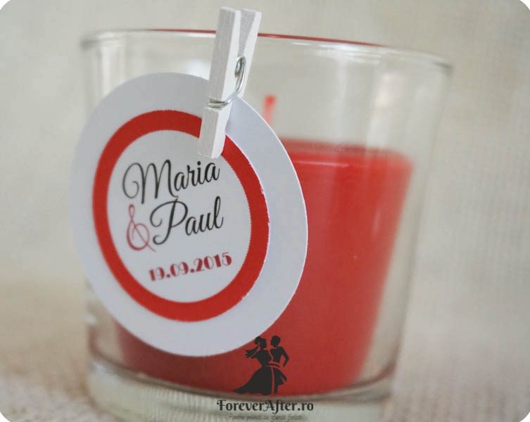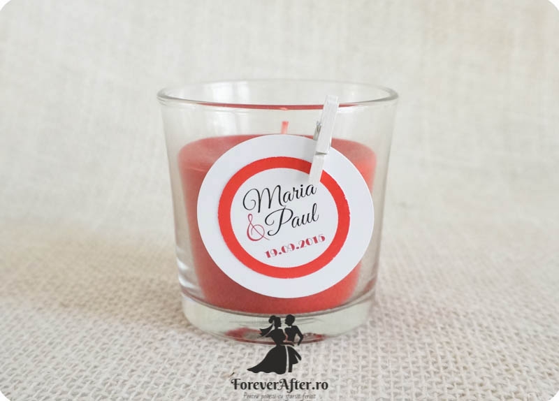 Marturie lumanare parfumata in pahar Red Circles, este accesorizata cu un tag si un clestisor alb, lumanarea are aroma de capsuni.