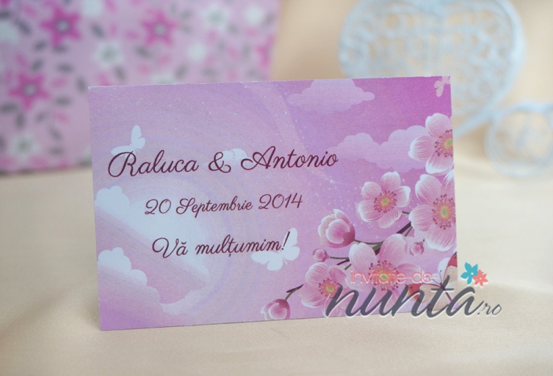 Se pot realiza in aceeasi gama asortata nuntii voastre si alte accesorii: carduri de confirmare, place-card-uri / plicuri de bani, marturii, meniuri si numere de masa, lista de asezare a invitatilor, etc.