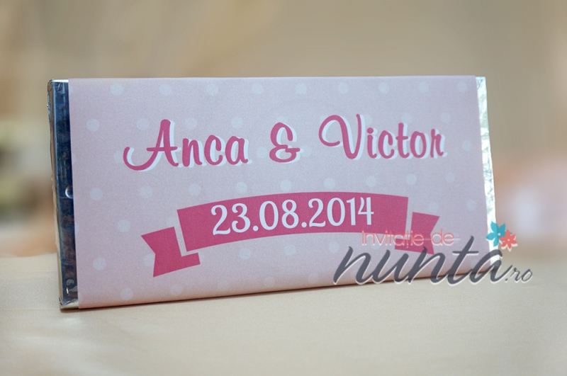 Marturie de nunta tableta de ciocolata, decorata cu o eticheta de culoare roz cu buline si pancarda. Eticheta se personalizeaza cu numele mirilor si data nuntii.
