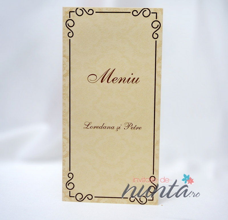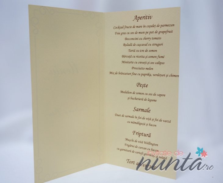 Pe coperta este tiparit cuvantul "Meniu", iar mai jos, numele mirilor. Meniul se pliaza pe verticala, iar textul se printeaza pe interior.