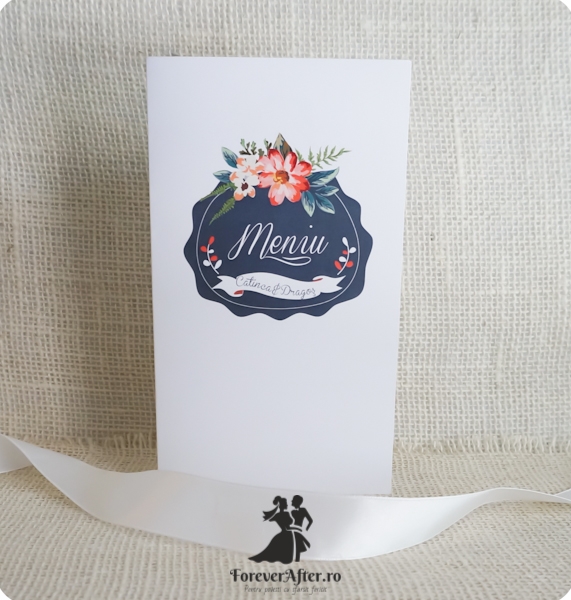 Meniul Lovely Flowers este creat din carton sidefat. Pe fata meniului este tiparit cuvantul "Meniu" intr-o coronita de flori.