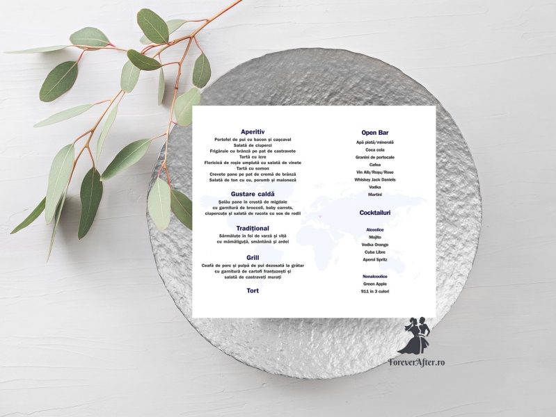 Meniul poate fi personalizat in functie de tematica sau cromatica nuntii.