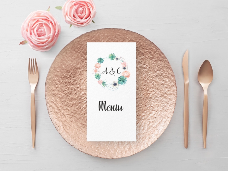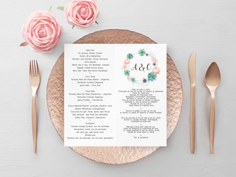 Meniul se pliaza pe verticala, iar textul se tipareste in interior. Este recomandat sa aveti 2 meniuri pe masa, iar daca masa este mai mare de 10 persoane, 3 meniuri pe masa.