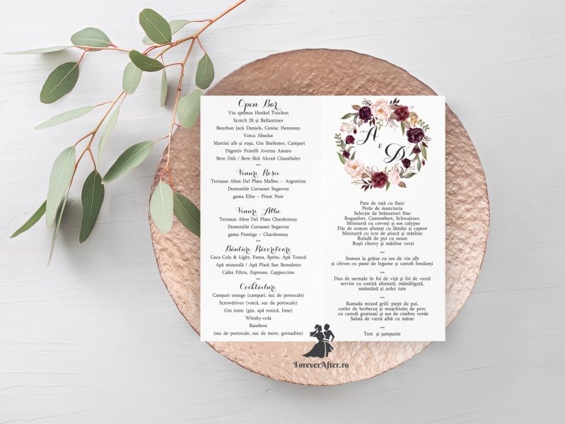 Meniul poate fi personalizat in functie de tematica sau cromatica nuntii.