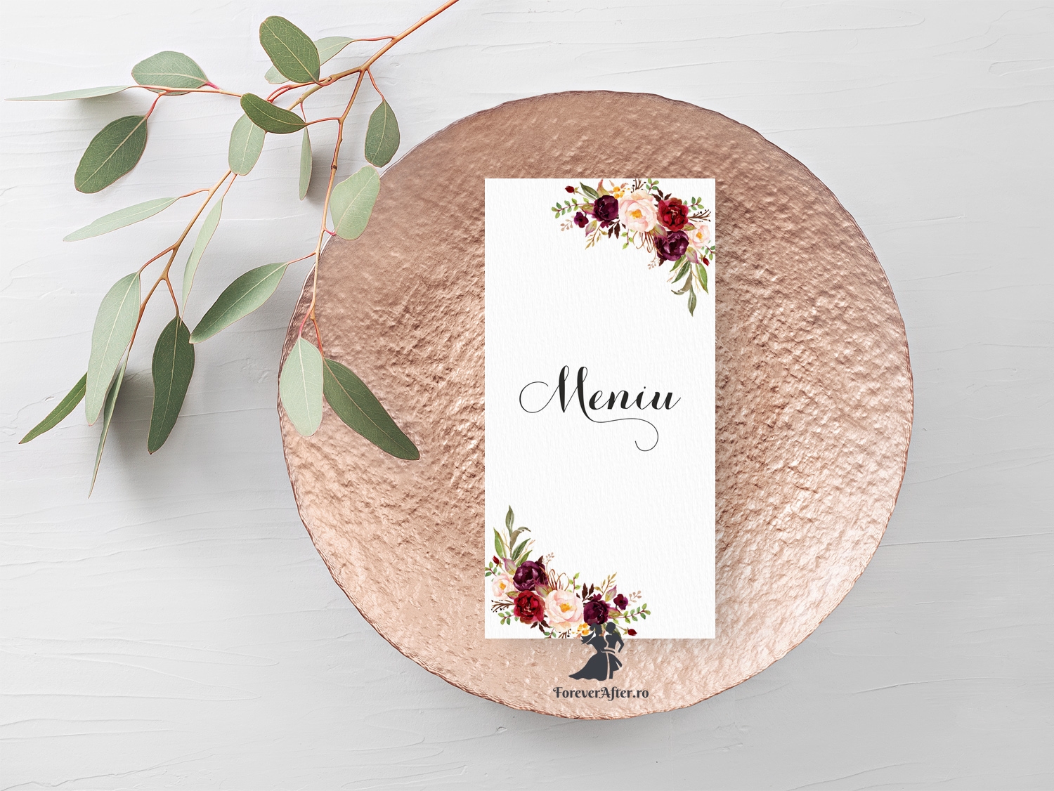 Meniul se pliaza pe verticala, iar textul se tipareste in interior. Este recomandat sa aveti 2 meniuri pe masa, iar daca masa este mai mare de 10 persoane, 3 meniuri pe masa.