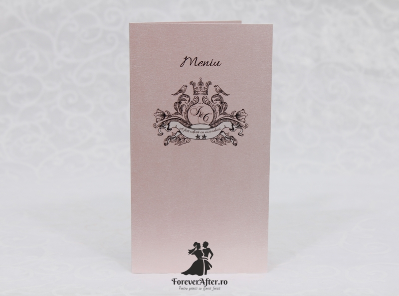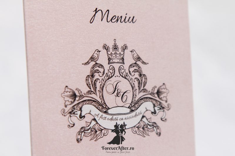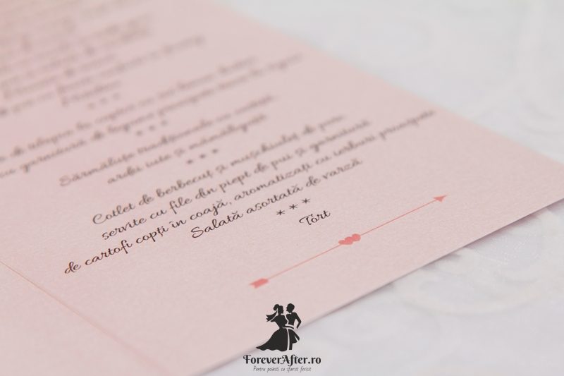 Meniu din carton sidefat in nuante de roz pal. Descopera un taram cu castele, printi si printese si povesti de dragoste fara sfarsit asa cum este si povestea voastra. Meniul se pliaza pe verticala, iar in interior se tipareste textul.