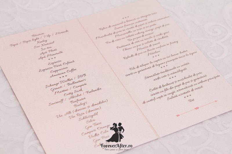 Meniul poate fi personalizat in functie de tematica sau cromatica nuntii.