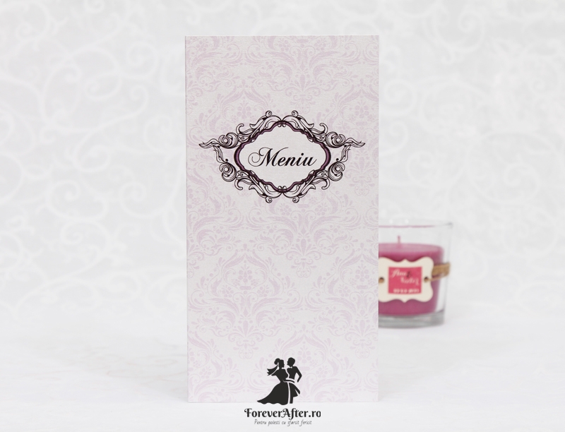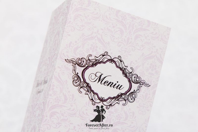 Meniu din carton sidefat cu imprimeu Damask. Combinatia dintre acesta si culoarea mov este o alegere eleganta. Meniul se pliaza pe vertical, iar textul se tipareste in interior.