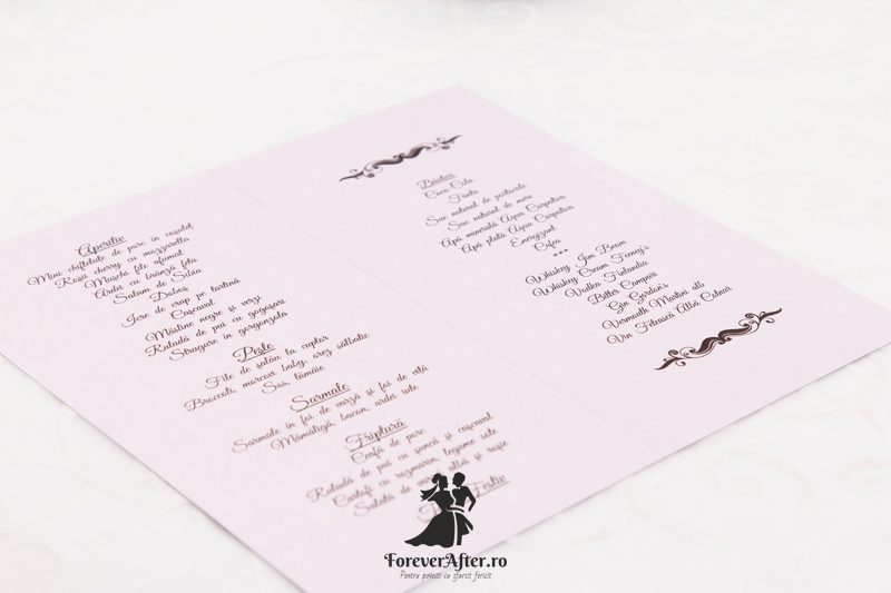 Meniul poate fi personalizat in functie de tematica si cromatica nuntii.