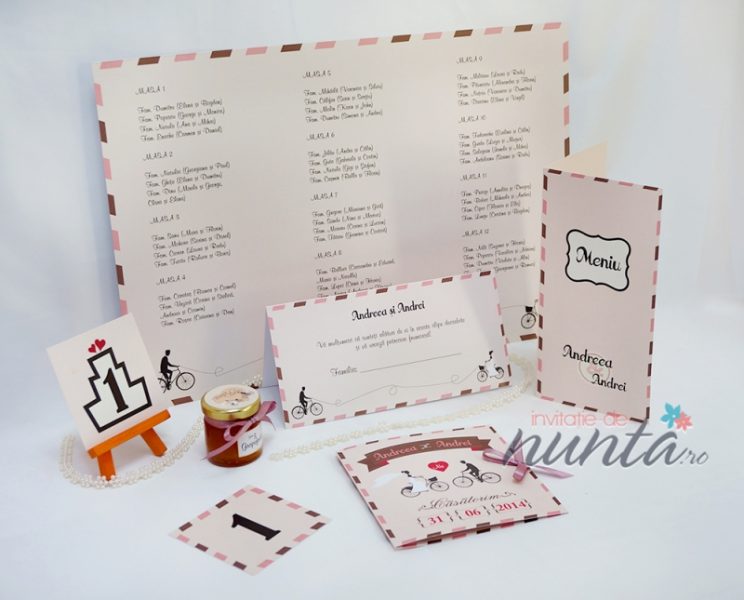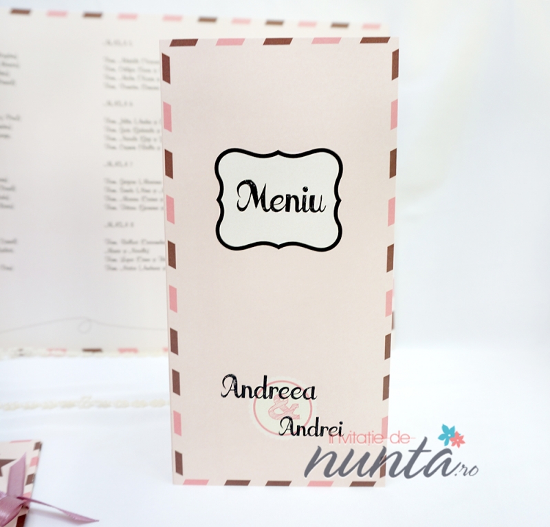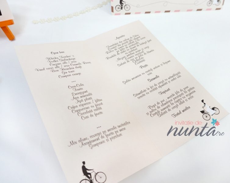 Meniu din carton mat, roz pal, cu chenar in dungi. Pe fata meniului este tiparit cuvantul "Meniu" intr-un chenar cu margine neagra, iar in partea de jos numele mirilor. Meniul se pliaza pe verticala, iar in interior sunt ilustrati doi miri pe biciclete. Textul meniului se tipareste in interior.