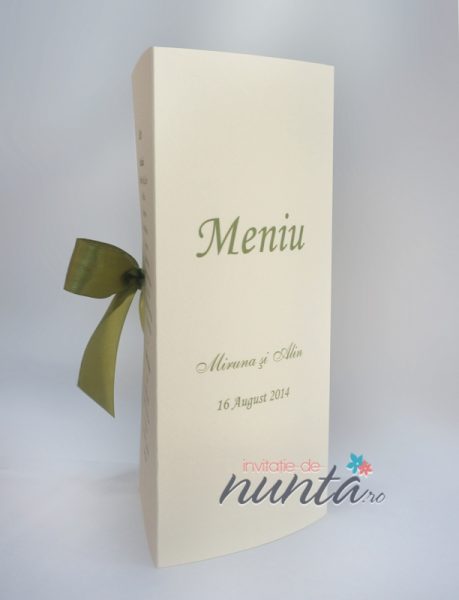 Meniu din carton crem, texturat. Cartonul se indoaie sub forma de triunghi, avand 3 fete disponibile pentru tiparire. Meniul se prinde cu ajutorul unei fundite din satin verde.