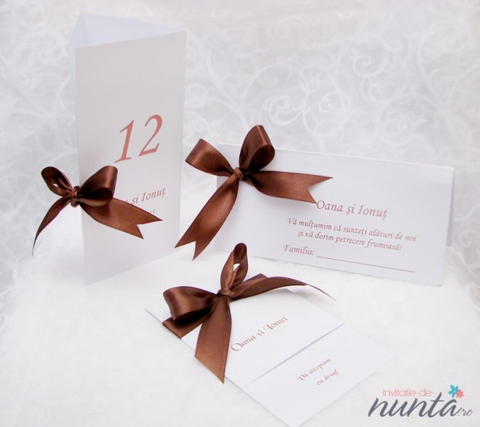 Se pot realiza in aceeasi gama asortata nuntii voastre si alte accesorii: carduri de confirmare, place-card-uri / plicuri de bani, marturii, meniuri si numere de masa, lista de asezare a invitatilor, etc.