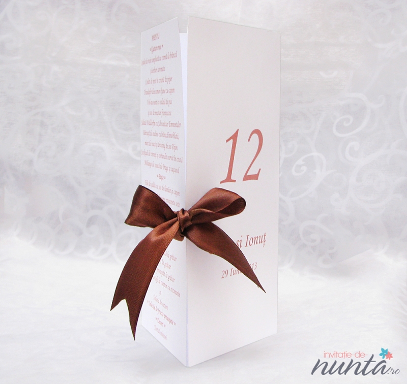 Meniu din carton alb, mat. Cartonul se indoaie sub forma de triunghi, avand 3 fete disponibile pentru tiparirea meniului, numarului de masa si meniului de bauturi. Meniul se prinde cu ajutorul unei fundite din satin maro.