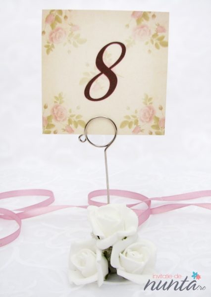 Numar de masa din carton crem, texturat si fundal vintage cu trandafiri roz. Pe acest card se pot imprima numerele meselor, folosind orice tip de text si orice culoare doriti.