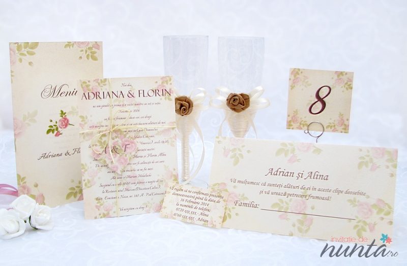 Se pot realiza in aceeasi gama asortata nuntii voastre si alte accesorii: carduri de confirmare, place-card-uri / plicuri de bani, marturii, meniuri si numere de masa, lista de asezare a invitatilor, etc.