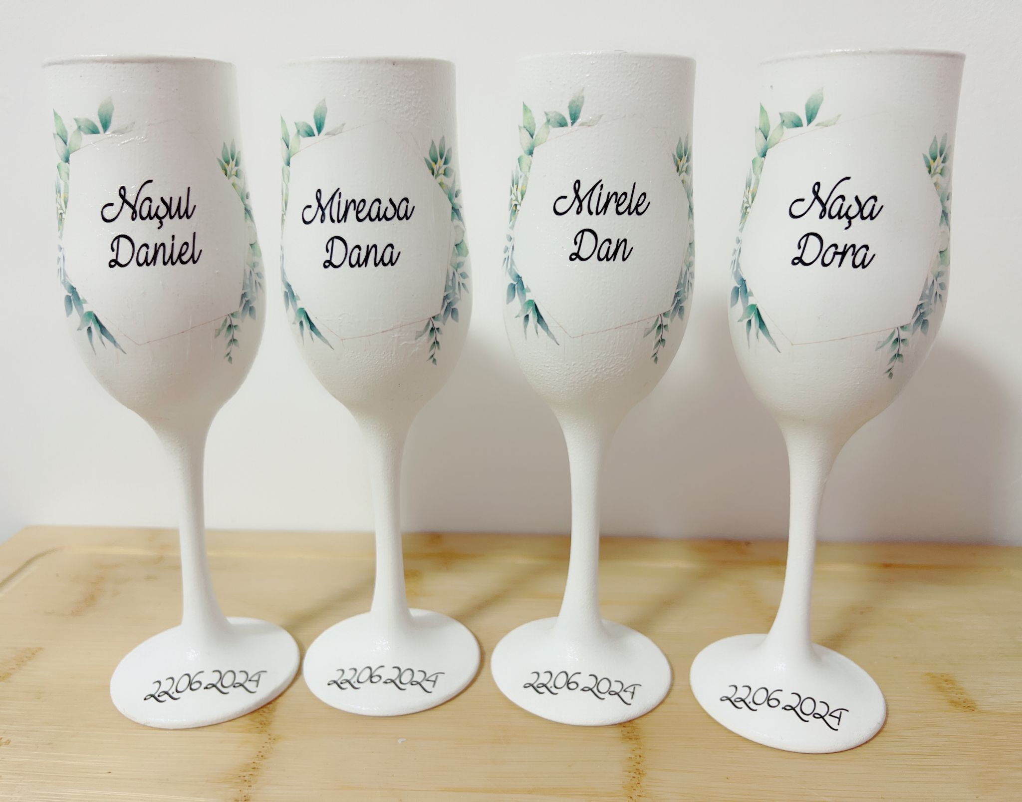 Set de pahare de sampanie pentru nunta, personalizate manual pentru miri si nasi. Designul greenery este perfect pentru o nunta moderna si romantica.