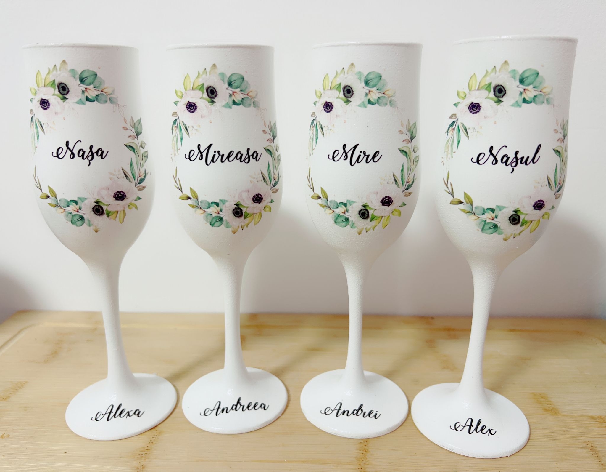 Set de pahare de sampanie pentru nunta, personalizate manual pentru miri si nasi. Designul greenery cu flori albe este perfect pentru o nunta moderna si romantica.