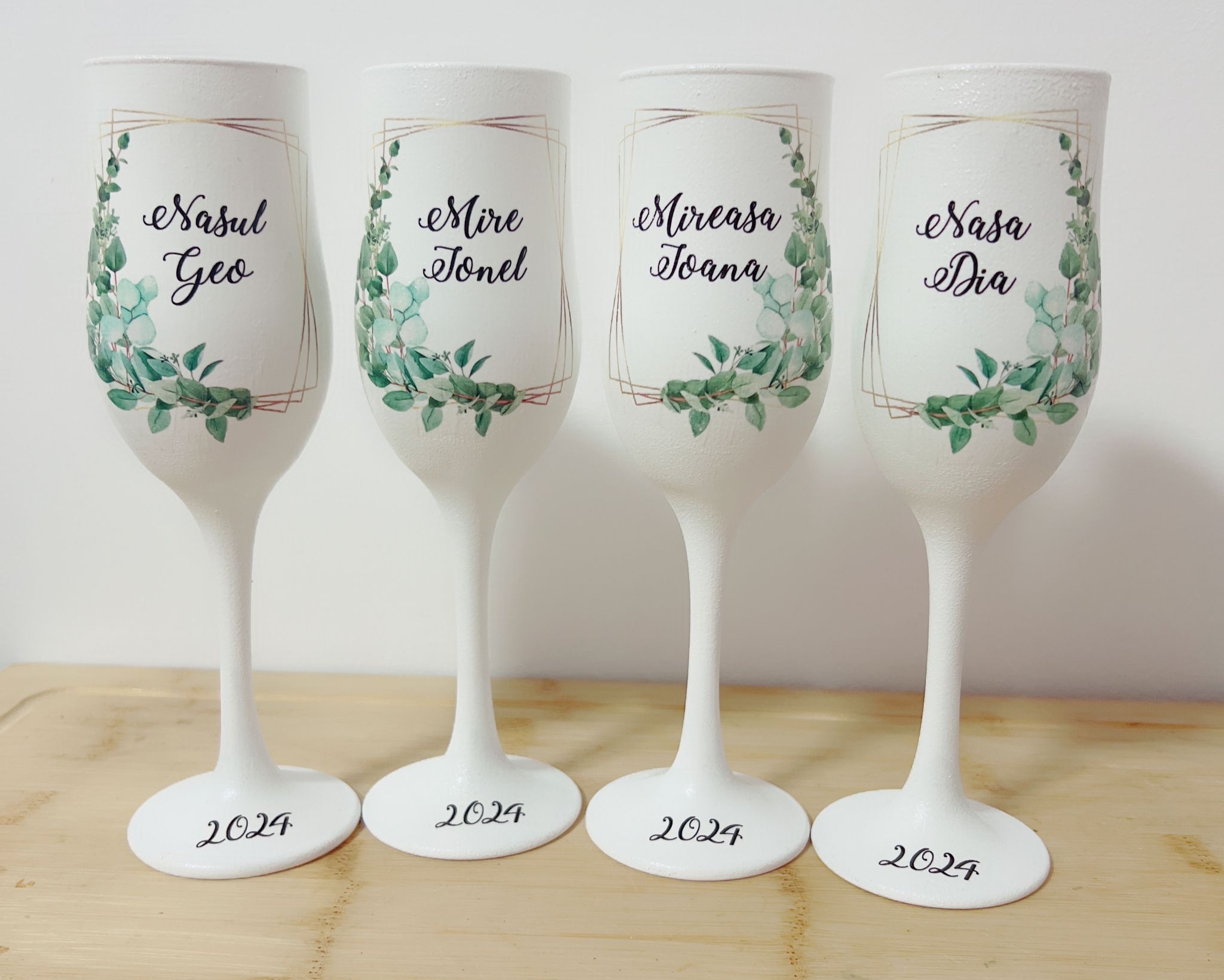 Set de pahare de sampanie pentru nunta, personalizate manual pentru miri si nasi. Designul greenery cu elemente aurii, verdeata si flori este perfect pentru o nunta moderna si romantica.