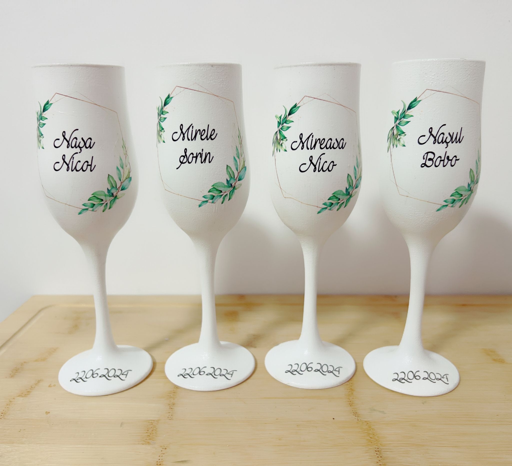 Paharele se pot personaliza cu numele mirilor si al nasilor, data nuntii si poza, in functie de preferintele voastre.