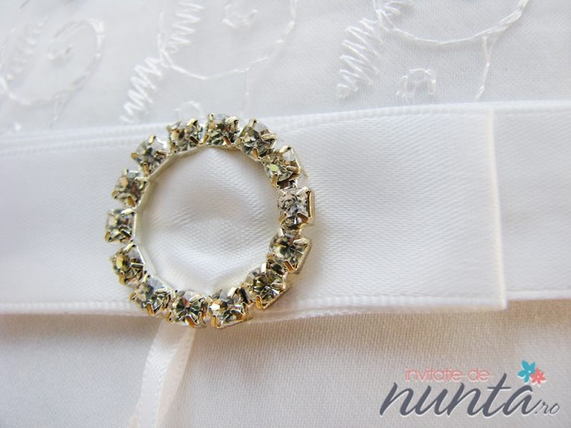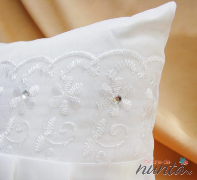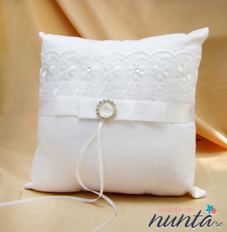 Pernuta pentru verighete de culoare alba, accesorizata cu dantela cu model floral si fundita din satin alb, cu brosa din strasuri.