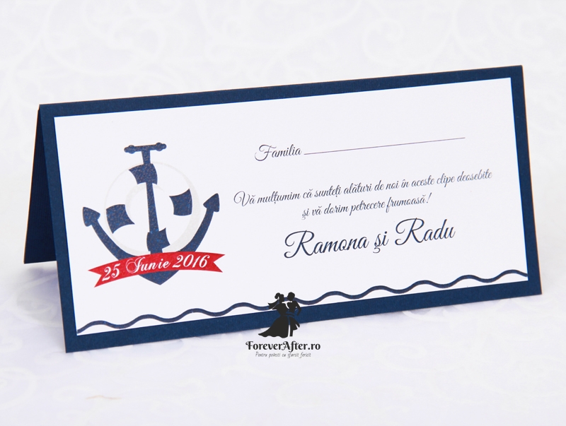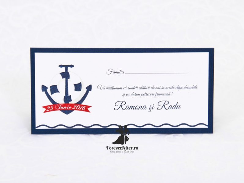 Place card-ul tip plic de bani Blue Anchor este ideal pentru o nunta eleganta cu tema marina. El este format din un carton bleumarin, texturat, pe care sunt prinse 2 cartoane albe, texturate, imprimate cu textul vostru.