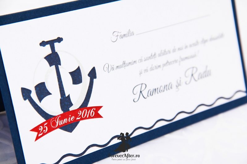 Pe partea din fata a plicului este imprimata o ancora, vedeta a gamei Blue Anchor, impreuna cu data nuntii. In interiorul place card-ului se afla un buzunar pentru bani.