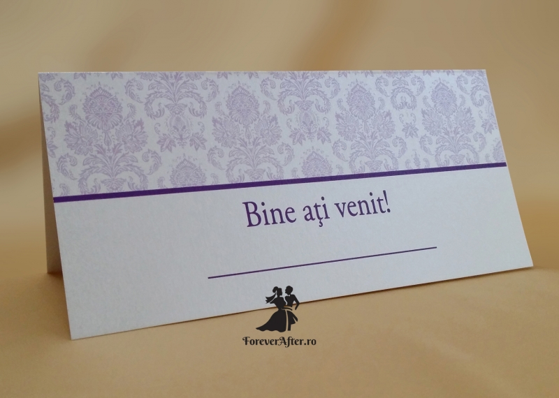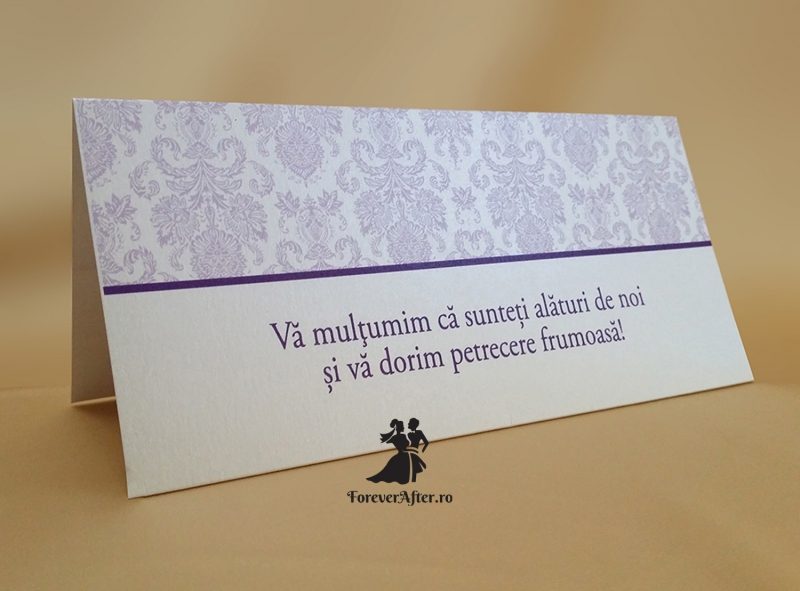 Plic de bani confectionat din carton sidefat cu model damask mov in partea de sus. Plicul se indoaie pe orizontala, avand un buzunar pentru dar si poate fi folosit si pe post de card de masa.
