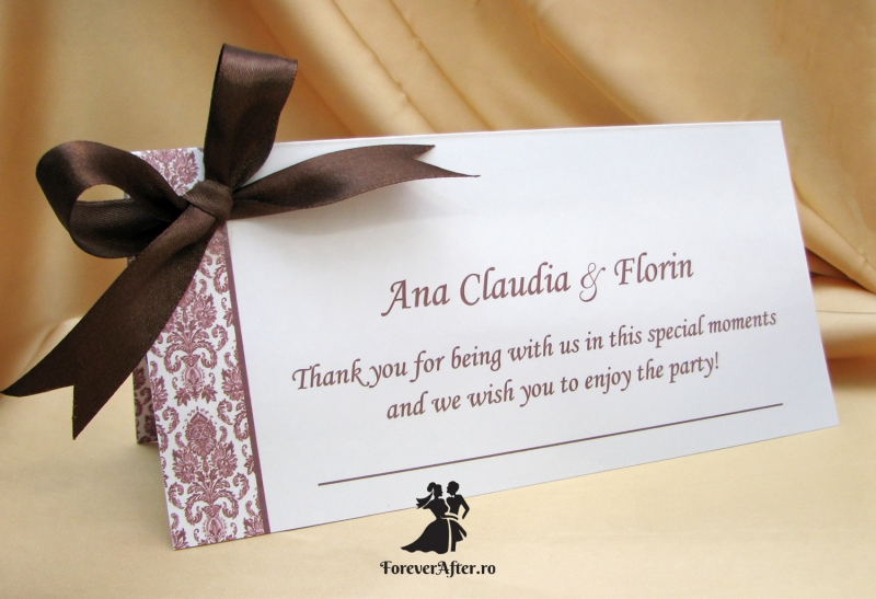 Se pot realiza in aceeasi gama asortata nuntii voastre si alte accesorii: carduri de confirmare, place-card-uri / plicuri de bani, marturii, meniuri si numere de masa, lista de asezare a invitatilor, etc.